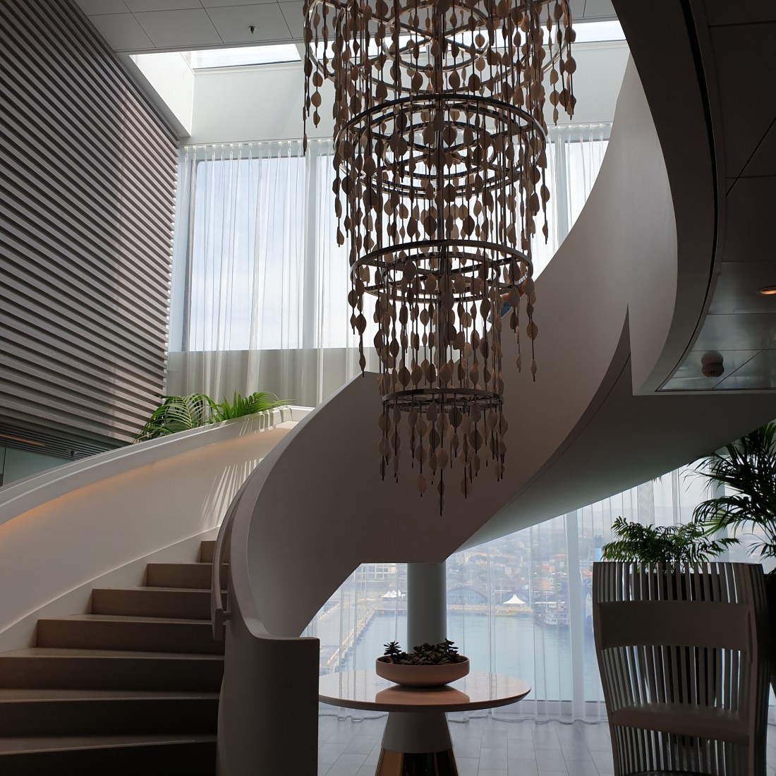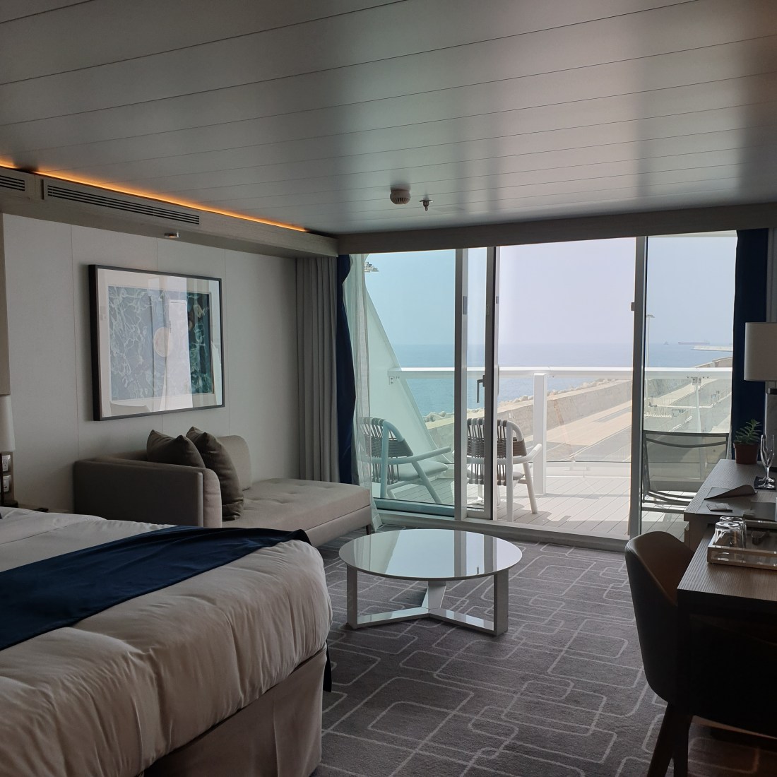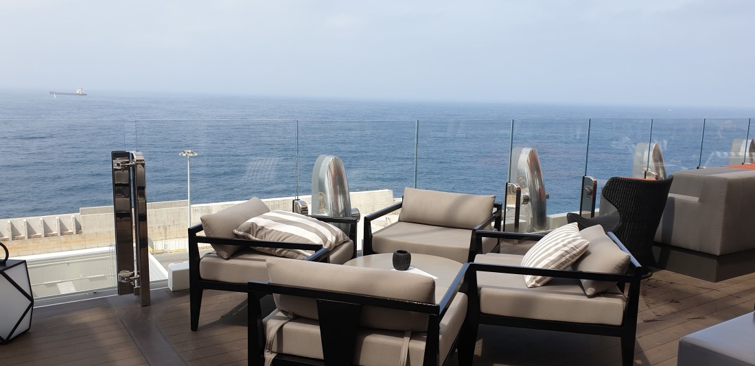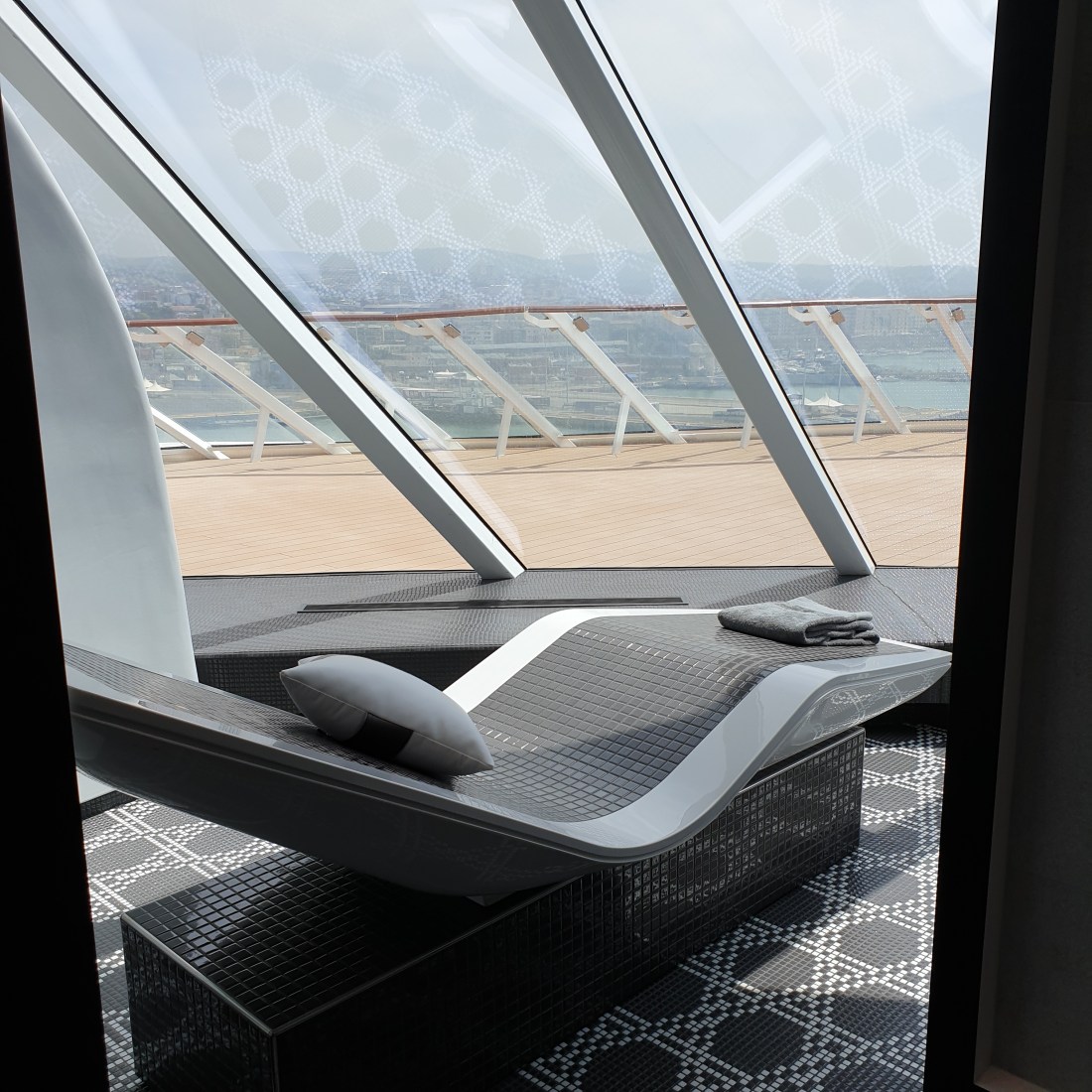 Nell’approcciare questa originale unità varata nel 2018, le due caratteristiche che subito saltano all’occhio sono sicuramente la prua – che, a seconda della prospettiva da cui la si guarda, regala effetti ottici differenti – e la piattaforma arancione in alto, il Magic Carpet, che può scendere lungo due “binari” fino a livello del mare. Poi, proseguendo verso la gangway a centro nave per accedere all’interno, notiamo subito la differenza con la gran parte delle altre navi: uno spazio sensoriale potremmo definirlo, minimale, raffinato, ampio, dove vetrate, piante, luci blu ed azzurre e pannelli a led ci accolgono in un’atmosfera immediatamente avvolgente… Destination Gateway… già rapiti dalla presentazione delle diverse destinazioni a cui la Edge ci porterà… già completamente convinti che da questa nave non vorremmo più scendere. E proseguiamo la nostra visita, chiedendoci cosa ci aspetterà. Sì, le foto le abbiamo viste già, ma vi assicuriamo che di persona è ben oltre le aspettative. La nave è interamente progettata in 3D e nasce dalla sinergia di architetti e designers d’interni che hanno saputo davvero realizzare un concetto straordinario.