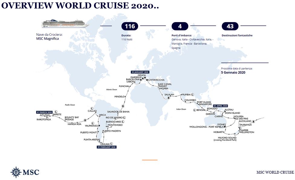 Gli ospiti a bordo potranno essere protagonisti del viaggio più bello della propria vita, visitando ben 43 destinazioni differenti in 117 giorni: da Ushuaia in Argentina a Valparaiso in Cile, da Callao/Lima in Perù a Rarotonga (Isole Cook) e poi ancora Nuova Zelanda, Australia, Papua Nuova Guinea, Bali, India e Giordania, con visita a Petra.