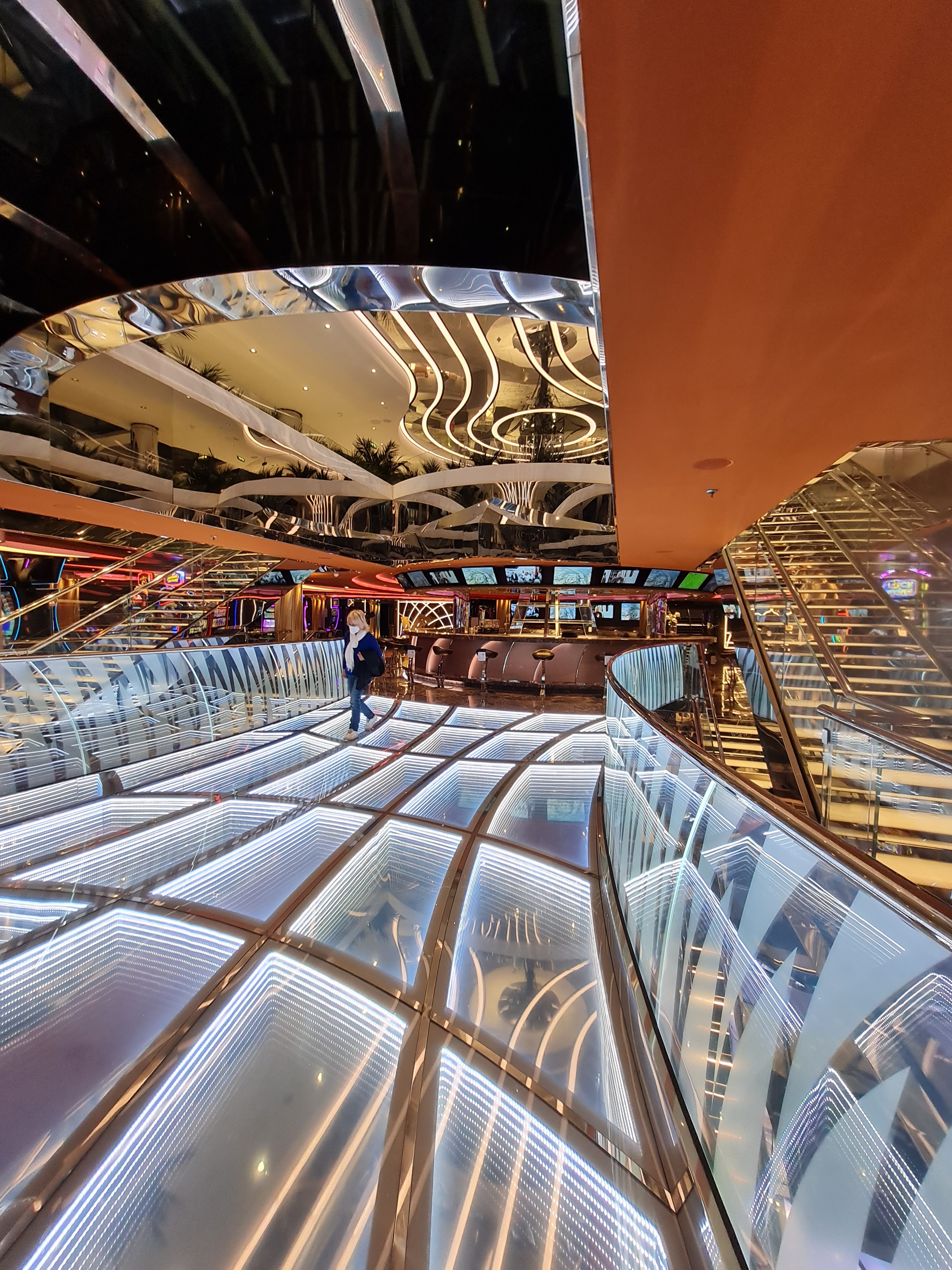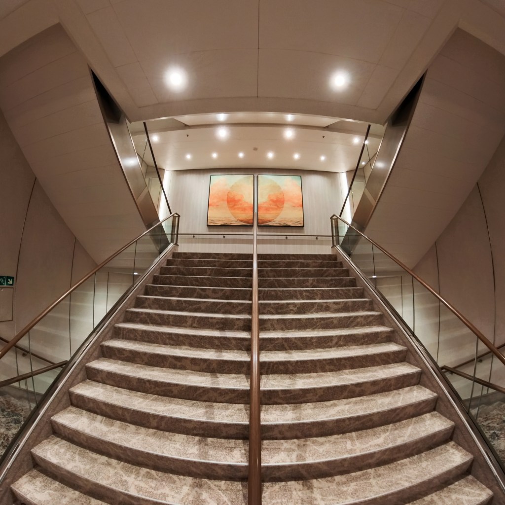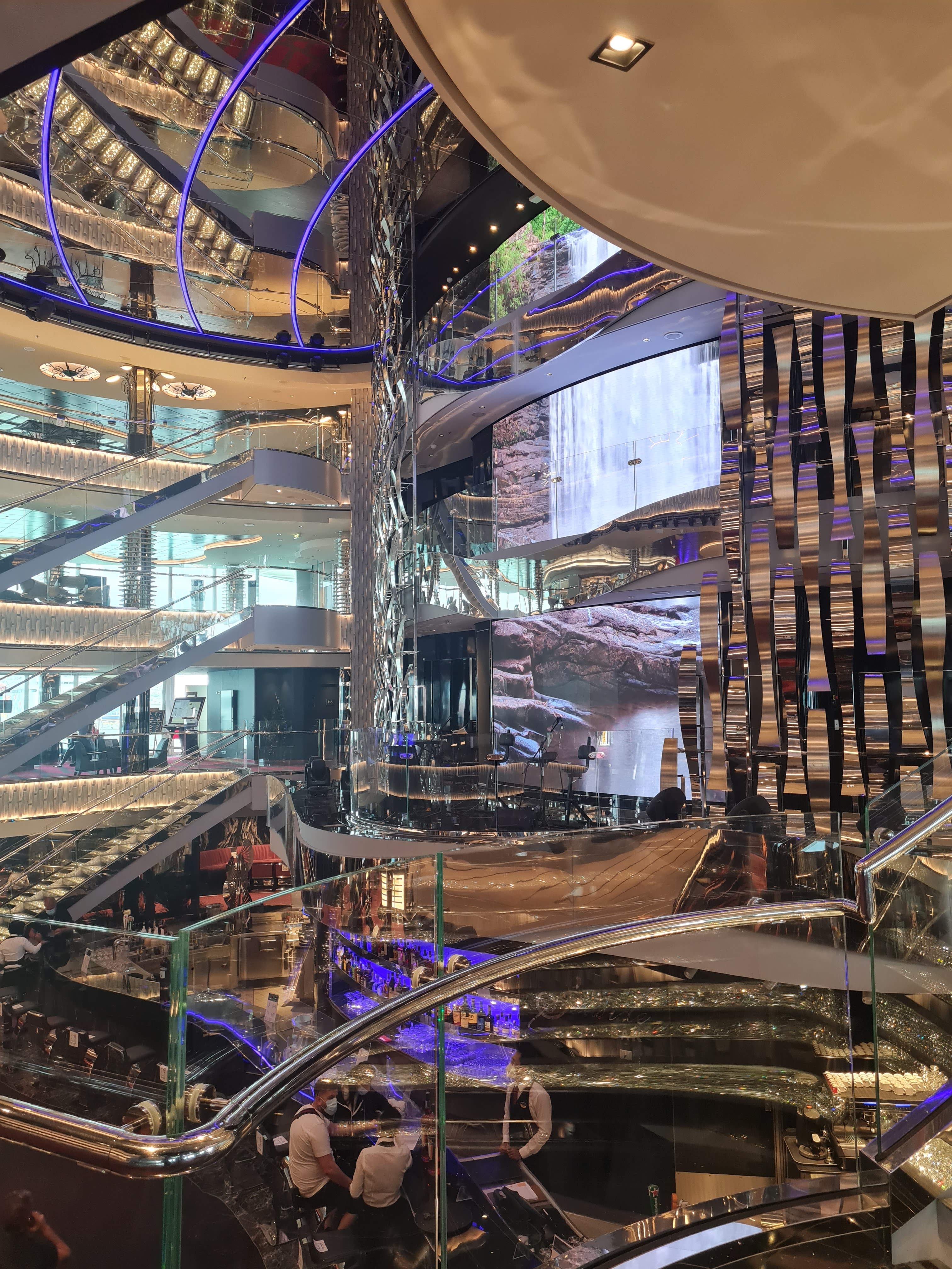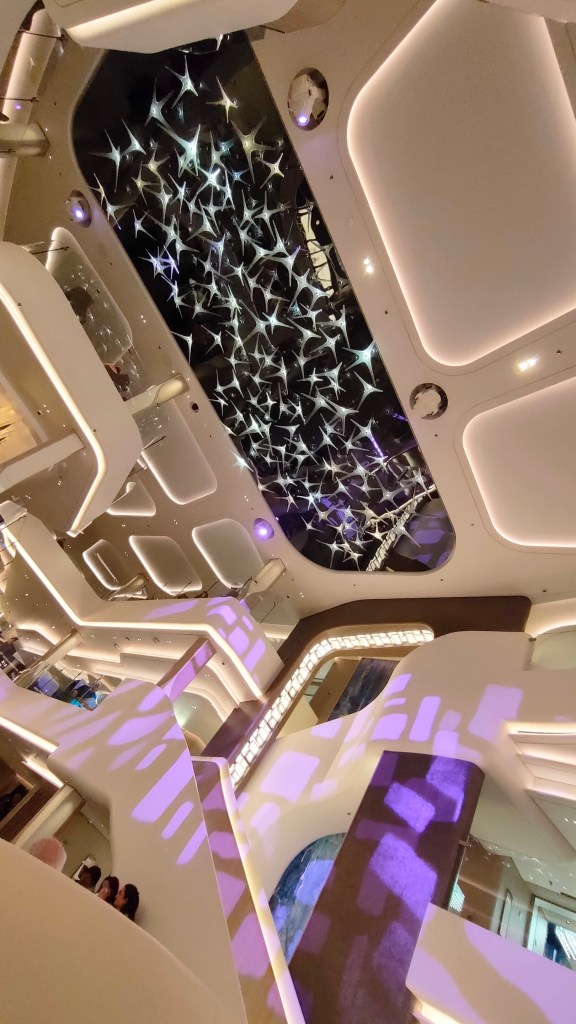 La distribuzione degli ambienti alberghieri è molto funzionale e quindi i flussi dei passeggeri sono ottimali, limitando il rischio di assembramenti eccessivi di persone. Il passeggero appena imbarcato rimane subito stupito dalla luminosità dell’atrio principale dotato di due ascensori panoramici che portano fino alla discoteca dove è possibile ballare attorniati da panorami mozzafiato.