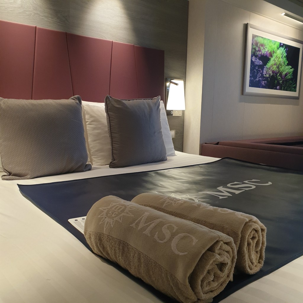 Pochi passi tra opere di Van Gogh rivisitate e mi trovo davanti alla mia cabina; appoggio la scheda – click (verde) – apro e… wow…che bella… Grigio chiaro e bordeaux, faretti che illuminano gli spazi con eleganza e sobrietà, un lettone comodo e spazioso, il balcone, un bel divano, il bagno piccolo ma funzionale e comodo, un grande display, Zoe.