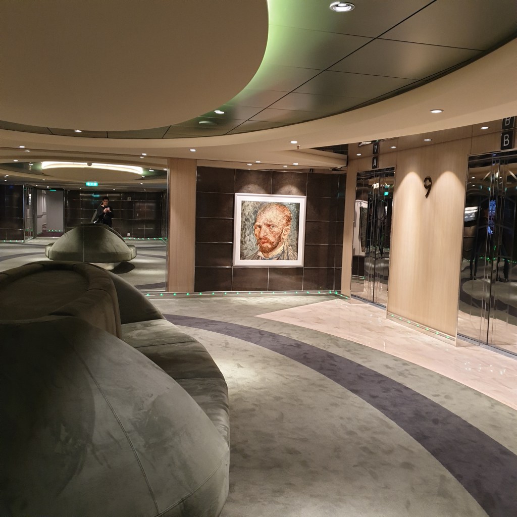 Ma io non vedo l’ora di andare in cabina, la 9240, con balcone lato dritto al ponte Van Gogh, uno dei miei artisti preferiti tra l’altro. L’ascensore lo trovo funzionale: scegli il ponte sul display e compare la lettera corrispondente ad uno degli ascensori disponibili, così mi posiziono davanti a quello assegnatomi senza dover finalmente torcere il collo per capire quale stia arrivando per primo!