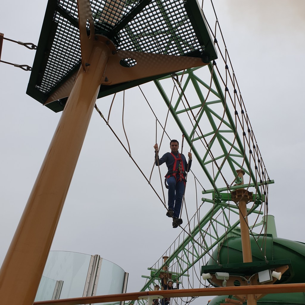 Il giorno di navigazione da Malta a Barcellona è tuttavia mite seppur nuvoloso, così decidiamo anche di salire al ponte 19 e provare l’Himalayan Bridge! Peccato…Diego ci tiene a provarlo, ma l’accesso è consentito solo dai 7 anni in su; mio marito – in una botta di coraggio e da vero eroe intrepido – decide di provare l’attrazione (gratuita); così, firmata un’informativa presso il personale di bordo, si lascia imbracare ed inizia il percorso sospeso in aria, tra ragazzini velocissimi ed adulti titubanti.