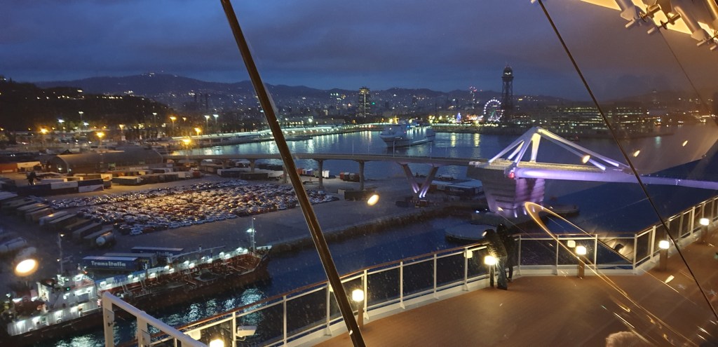 I giorni seguenti scorrono piacevoli, a tratti veloci e a tratti lenti. Troviamo bel tempo il primo giorno e discreto i successivi, a parte Marsiglia (ventaccio e pioggia); poco male, approfittiamo di goderci la nave ed i nostri posti preferiti. La maggior parte del tempo lo trascorriamo allo Sky Lounge… Forse il momento più magico è quello della sosta a Barcellona: il panorama serale che si gode da qui, con la musica sottofondo, le luci soffuse ed il cocktail in mano, è indimenticabile. Un altro posto piacevole è l’Edge Bar affacciato sull’atrio: è l’angolo per la nostra pausa caffè dopo pranzo, aroma gustoso e cioccolatino Venchi fondente delizioso; intanto la musica si diffonde dall’Infinity Atrium dove artisti notevoli si esibiscono in un repertorio che spazia dal pop alla musica classica al rock, solo strumento e voce… eccezionale.