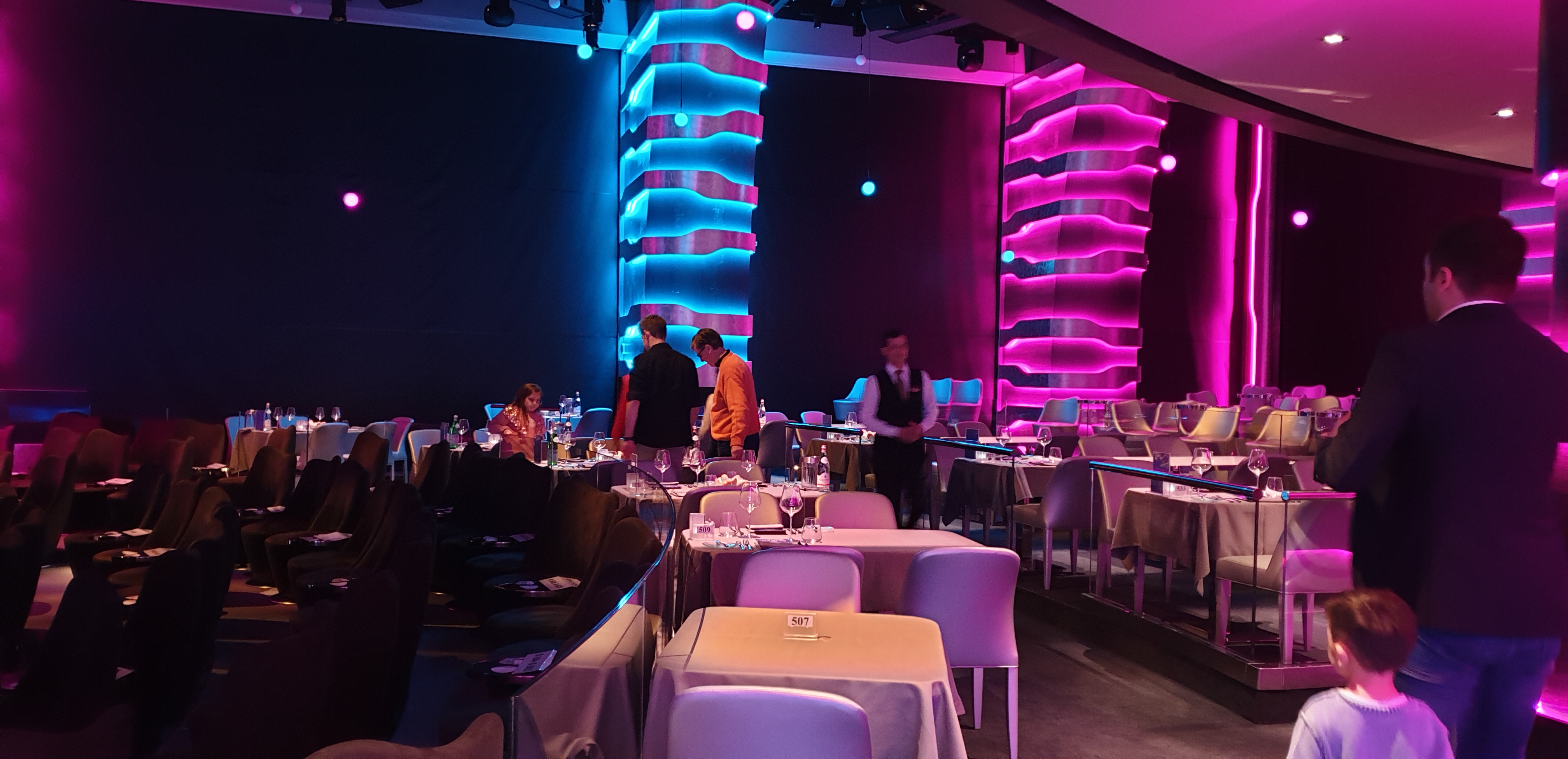 Un giro prima della cena è d’obbligo perché la curiosità è tanta, ma Diego il piccolo despota di soli 4 anni decide che bisogna prima di tutto andare al miniclub, al ponte 18. Doremiland lo rapisce all’istante con i suoi Lego colorati ed il sorriso del team a loro dedicato. Chiede di restare lì subito – mio marito ed io ci guardiamo – ok va bene. “Passate tra mezzora per vedere come sta” ci dice uno dei ragazzi alla reception del club. Bene, cominciamo il nostro tour esplorativo della nave da soli senza il mio piccolo “er protesi”! Già lì al ponte 18, superato Doremiland e l’Attic Club, vediamo l’Horizon Bar che ci colpisce per la meravigliosa vista a poppa ed il solarium disposto tipo un anfiteatro attorno alla piscina. Decidiamo di tornare indietro e, subito di fronte l’ingresso del miniclub, c’è quello che sarebbe poi diventato il nostro posto preferito: lo Sky Lounge (adults only). Una piccola oasi di pace, tutta vetrate, da cui ammirare il mare e la vista sulla piscina illuminata di sera e, proprio di fronte, un enorme display su cui scorrono immagini di spiagge da favola o di fondali marini mozzafiato, mentre ascolti dell’ottima musica chill in sottofondo e sorseggi uno dei fantastici cocktails proposti dal menu. Difficile alzarsi da questi comodi divanetti e lasciare il paradiso per verificare se il piccolo despota sia in contestazione o meno…
